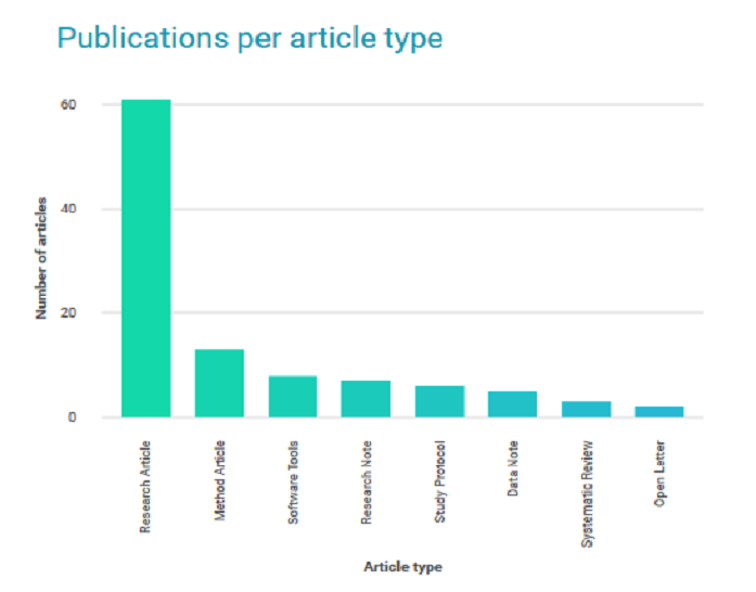 The published research covers a range of article types, from the expected traditional research article through to data notes, research notes, software tools and study protocols – important work that is more difficult to get published through other journals. The breakdown by publication type is shown below.