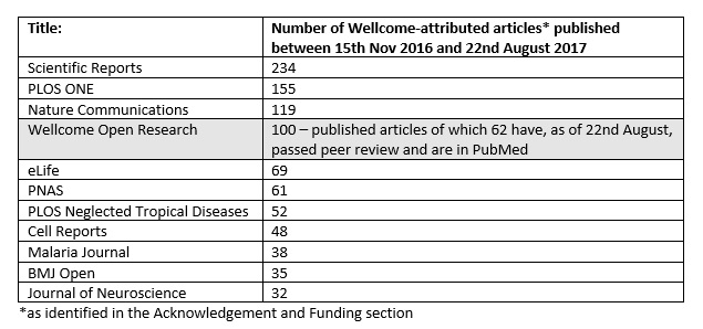 Table 1: Number of publications at Wellcome Open Research compared with other journals used by Wellcome-funded researchers